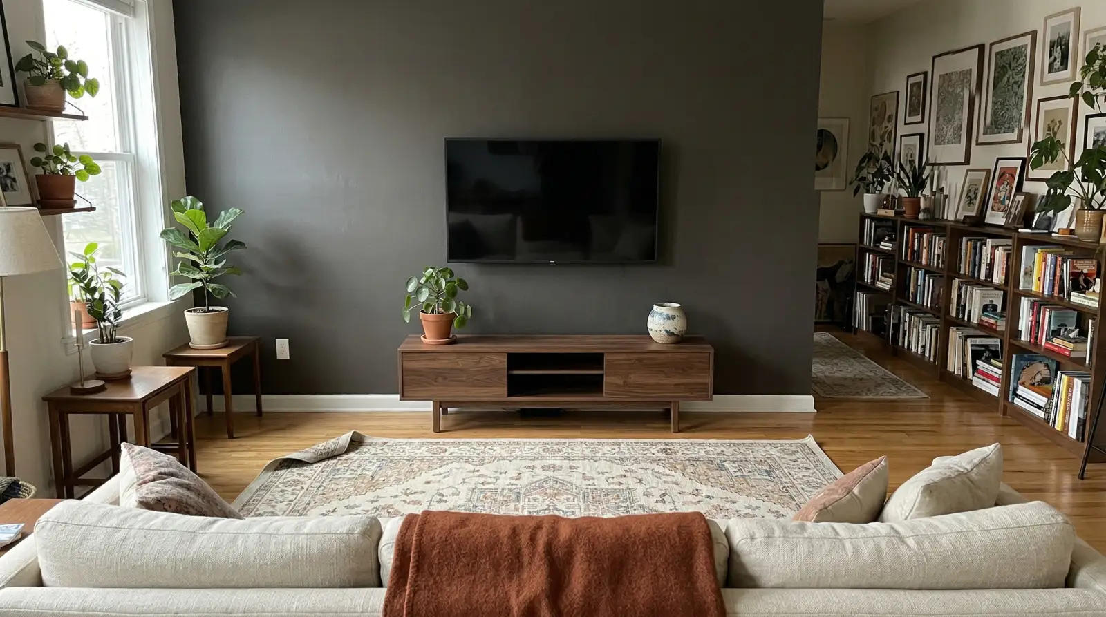 It doesn’t have to match, but it does have to relate. The easiest way to achieve this is to pull an undertone from an existing element in the room, such as the wood tone of your floor or a color in your rug, and find a paint color that shares that undertone. That connection creates cohesion even when the TV wall is significantly darker than everything else.