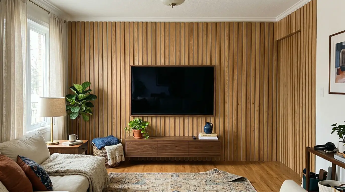 The good news is that neither trap is hard to avoid once you understand what makes these walls work in practice. This is about wood slat walls for living rooms specifically, with the TV wall as the most common and most rewarding application. By the end, you’ll know whether it’s right for your space, what it actually costs, and how to do it without hiring anyone.