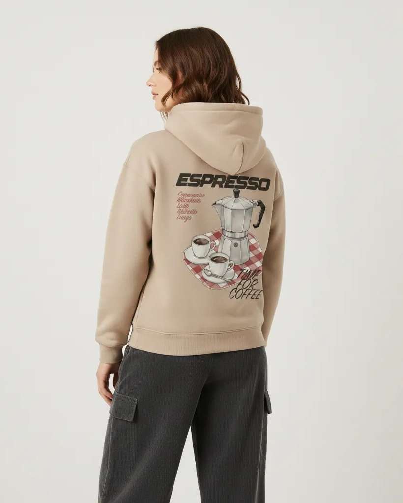 This isn't just another beige sweatshirt. It features a detailed, retro illustration of a classic Italian Moka pot and espresso cups on the back. The neutral tones makes it one of the most versatile hoodies women fashion has to offer this season.